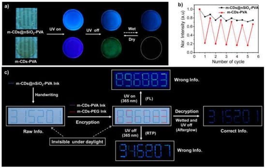 Expanding emission lifetimes of carbon dots by forming hydrogen bonds with PVA that restrain triplet emission species leading to room temperature phosphorescence [19,20]. Information protection applications of m-CDs@nSiO2. (a) Photographs of m-CDs@nSiO2-PVA and m-CDs-PVA films under daylight, and irradiation with 365 nm UV lamp on and off when the films are desiccated and wetted; (b) Intensities of afterglow alterations of m-CDs@nSiO2-PVA and RTP changes of m-CDs-PVA films under dry and wet conditions for five cycles; (c) Schematic illustration of information protection (encryption and decryption) processes by using m-CDs@nSiO2-PVA, m-CDs-PVA, and m-CDs-PEG inks. (Reproduced with permission from ref. [19]. Copyright 2017 American Chemical Society, Washington, DC, USA).