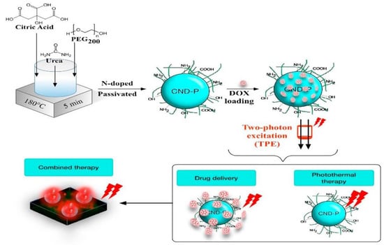 Schematic diagram of the synthesis procedure of biocompatible PEG-passivated carbon dots with a quantum yield of 53% for multifunctional on-demand drug release and combined chemo-photothermal therapy via two-photon excitation. (Reproduced with permission from ref. [22]. Copyright 2017 Elsevier B.V., Amsterdam, Netherlands).