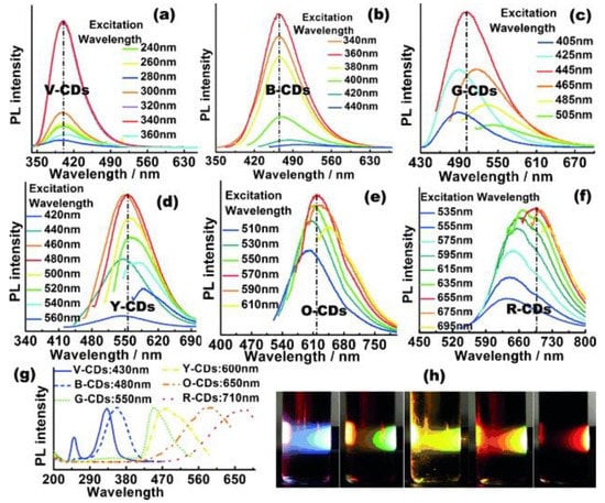 Tuning carbon dots’ emission to violet, blue, green, yellow, orange, and red: (a–f) PL spectra of V-, B-, G-, Y-, O-, and R-CDs, showing different strongest emission peaks; (g) PLE spectra of the six samples; (h) emission photos of different carbon dots excited by white light. (Reproduced with permission from ref. [31]. Copyright 2015 John Wiley & Sons, Hoboken, NJ, USA).