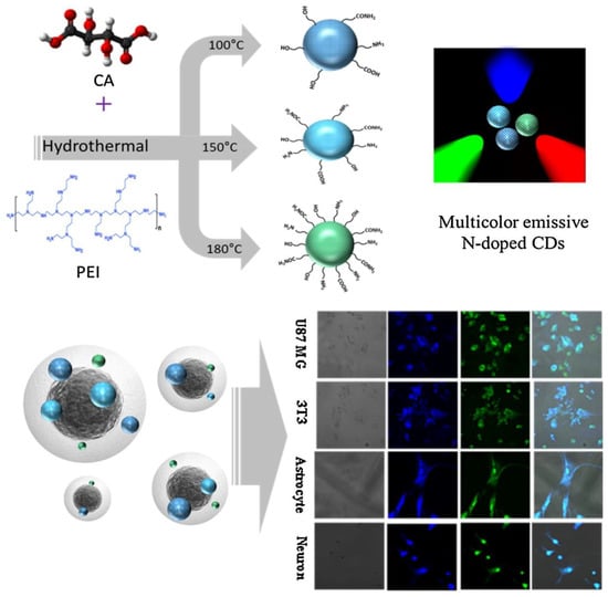 PEI was also used by Kundu and colleagues to obtain multicolour emissive nitrogen-doped carbon dots [32]. In their approach, b-PEI was mixed once again with citric acid and a hydrothermal reaction at variable temperatures (100 to 180 °C) and reaction times (5 to 20 h) took place. As a result, carbon dots with relatively high quantum yield values ranging from 33.7% to 56.2% were retrieved and were successfully employed for human brain tumour, fibroblast, neuron, and astrocyte cells imaging (Figure 4). It was also deduced that the carbon dots synthesized at higher temperature (180 °C) possessed improved fluorescence properties due to better surface functionalization and N-doping by b-PEI. Nonetheless, it should be noted here, in order to highlight also the significance of the previous described work by Hu et al. [31], that the multicolour emission in Reference [32] is based on the use of appropriate excitation wavelength (λexc. = 405 nm for blue, 488 nm for green, and 555 nm for red emission), whereas in contrast in Reference [31] all carbon dots materials are excited by the same white light [32].
