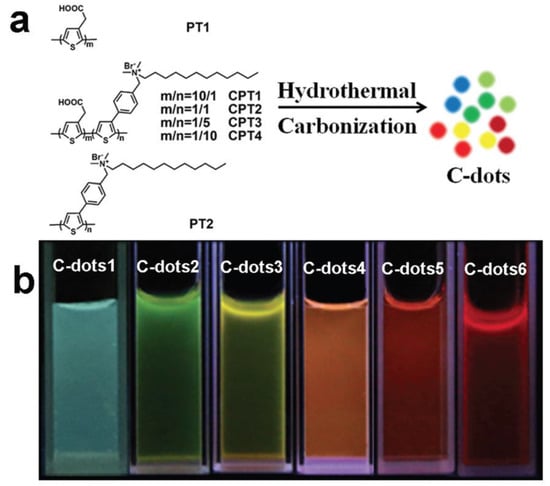 - Guo, L.; Ge, J.; Liu, W.; Niu, G.; Jia, Q.; Wang, H.; Wang, P. Tunable multicolor carbon dots prepared from well-defined polythiophene derivatives and their emission mechanism. Nanoscale 2016, 8, 729–734. [Google Scholar] [CrossRef] [PubMed]