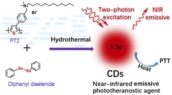 Schematic illustration for the preparation and working mechanism of two-photon-excited NIR-emissive S, Se-co-doped carbon dots by polythiophene and diphenyl diselenide. (Reproduced with permission from Reference [33]. Copyright 2017 Springer Nature, Basingstoke, UK).