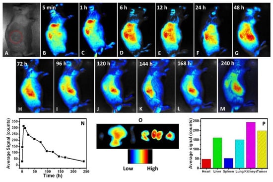 PEGylated carbon dots for NIR bioimaging: Time based in vivo red fluorescence images of BALB/c mouse bearing CT26 tumours after the intravenous (i.v.) injection of CyCD (the tumour is circled with a red dotted line). (A) 0 min (taken under natural light; the red circle marks the position of tumour); (B) 5 min; (C) 1 h; (D) 6 h; (E) 12 h; (F) 24 h; (G) 48 h; (H) 72 h; (I) 96 h; (J) 120 h; (K) 144 h; (L) 168 h; and (M) 240 h; (N) Average fluorescence intensity of the tumour area as a function of time; (O) Ex vivo imaging of the tissues 48 h post-injection (from left to right: heart, liver, spleen, lung, kidneys, and tumour); (P) Average fluorescent intensity of heart, liver, spleen, lung, kidneys, and tumour. (Reproduced with permission from Reference [25]. Copyright 2016 American Chemical Society).