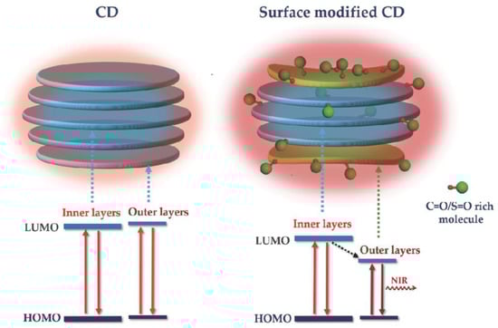 Schematic illustration of structure and energy level alignments of nontreated carbon dots (left column) and modified carbon dots with S=O/C=O-rich molecules/polymers (right column). The red (oxygen atom) and green double-bonded balls represent the C=O/S=O-rich molecule/polymer. (Reproduced with permission from Reference [38]. Copyright 2018 John Wiley & Sons).