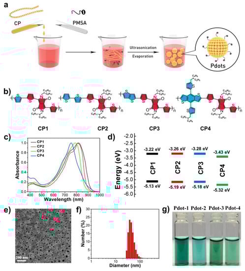 (a) Schematic illustration of preparation for Pdots; (b) Molecular structures of CP1-CP4; (c) UV-vis-NIR absorption spectra of CPs 1–4 in chloroform; (d) Band diagram representing the HOMO and LUMO levels of CP1-CP4 determined by cyclic voltammetry; (e) Representative TEM images of Pdot-1; (f) Size distribution histogram of Pdot-1 by DLS measurement; (g) Photographic images of Pdots 1–4 in aqueous solutions (25 µg/mL) after one month of storage at 4 °C. (Reproduced with permission from Reference [39]. Copyright 2016 American Chemical Society).