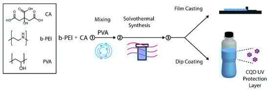 Process overview of CQD–PVA composite film synthesis. ① Citric acid (CA), branched polyethylene imine (b-PEI), and polyvinyl alcohol (PVA) mixed in water; ② Solvothermal synthesis; ③ Film casting by spiral bar coating and film drying. Alternatively, a glass vial was coated with the CQDs–PVA solution by dip coating. (Reproduced with permission from Reference [40]. Copyright 2017 The Royal Society of Chemistry).
