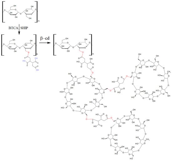 As can be seen in Figure 1, BTCA has four carboxylic acid groups, which can react with the hydroxyl groups of cellulose by esterification [,,], promoting β-cyclodextrin–cotton crosslinking. Heat or the salts of weak acids, such as sodium hypophosphite (SHPI), can act as catalysts of the esterification reaction [].