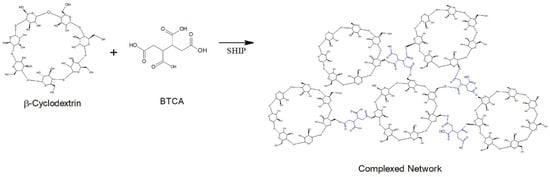In the case of functionalization of polyester fibers, a complex network is covered by coating by the crosslinked polymer formed between the β-cyclodextrin (βCD) and the BTCA via a polyesterification reaction [] (Figure 2).