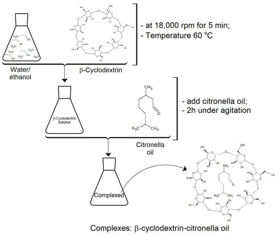 A solution of 50 mL of ethanol and water (1:3) and 3 g of βCD was prepared and emulsified at 18,000 rpm for 5 min at 60 °C. High temperature and strong agitation allowed the cyclodextrin to become entirely soluble. Subsequently, 5 g of citronella oil was added. After 2 h of stirring, the complexes were formed. This is a standard process (see Figure 3) proposed by several authors, such as [,,,].