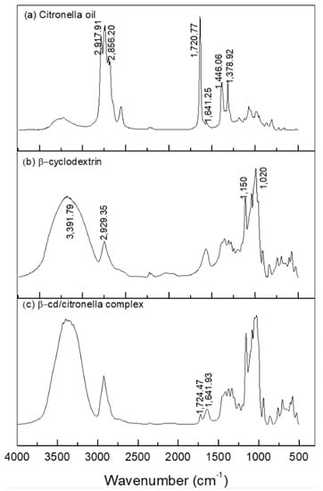 The formation of the citronella–βCD complex was also confirmed by FTIR-ATR. The spectra in the infrared region are shown in Figure 4.