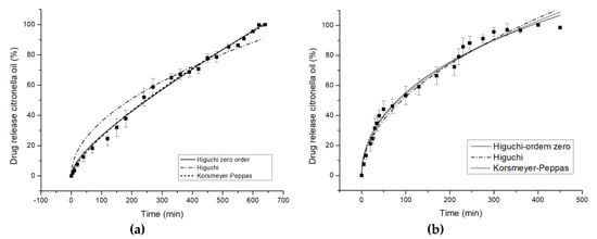 In vitro controlled release profiles of Higuchi zero order model, Higuchi model, and Korsmeyer-Peppas model in water at 37 °C for complex citronella essential oil applied on (a) cotton and (b) polyester.