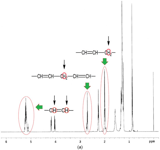 1H NMR spectra analysis of EPO, EPEO, and EPB (Figure 5a–c) showed characteristic chemical shifts for: 5.35 ppm protons of the olefin groups of fatty acids –CH=CH–; 5.25 ppm methane protons of glyceryl –CH2–CH–CH2–; 4.12–4.28 ppm methylene protons of glyceryl –CH2–CH–CH2–; 2.70–2.80 ppm protons of bis-allyl methylene groups –CH=CH–CH2–CH=CH–; 2.29–2.34 ppm protons of the α-CH2 group to the carbonyl group –CH2-CO–; 1.95–2.15 ppm protons of α-CH2 groups to the olefin group –CH2–CH2–CH=CH–; 1.50–1.60 ppm protons of the β-CH2 group to the carbonyl group –CH2–CH2–CO–; 1.25–1.40 ppm protons of CH2 groups in the fatty acid chain; and 0.86–0.88 ppm protons of ending –CH3 groups. A characteristic chemical shift for the epoxy groups was only observed on the EPEO spectrum: 3.1–3.2 ppm protons of epoxy group –CH–(O)–CH–; 2.85–2.95 ppm protons of α-CH2 groups to the epoxy group -–CH–(O)–CH–CH2– and 1.55 ppm protons of α-CH2 groups to the epoxy group –CH–(O)–CH–CH2–CH2–. Additional chemical shifts were only noticed in the EPB spectrum: 3.70–3.80 ppm protons of hydroxyl groups at the end of the chain –OH; and 3.42–3.50 ppm protons of α-CH2 groups to the hydroxyl group –CH2–OH [32].