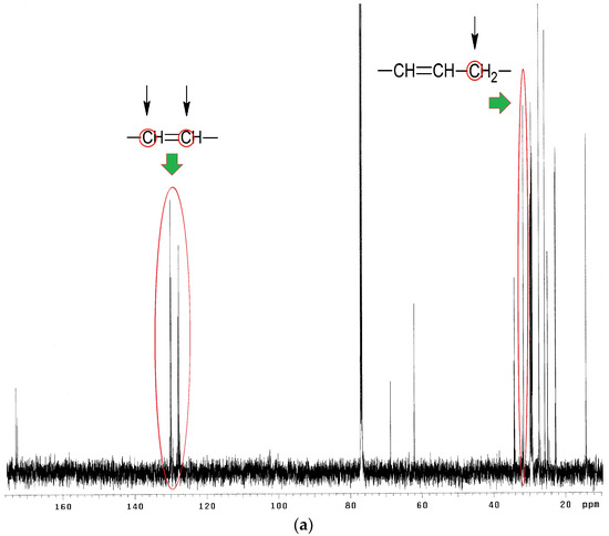 13C NMR spectra analysis of EPO, EPEO, and EPB (Figure 6a–c) showed characteristic chemical shifts for: 172.80–173.25 ppm carbons of carbonyl groups >C=O; 125.10–132.30 ppm carbons of olefin group of fatty acids –CH=CH–; 68.90 ppm methane carbons of glyceryl –CH2–CH–CH2–; 62.10 ppm methylene carbons of glyceryl –CH2–CH–CH2–; 33.00 ppm carbons of α-CH2 groups to olefin group –CH=CH–CH2–; 31.90 ppm carbons of α-CH2 groups to the carbonyl group –CH2–OOC–CH2–; 27.20–29.80 ppm carbons of CH2 groups in the fatty acid chain; 22.70 ppm carbons of penultimate groups –CH2–CH3; 14.30 ppm carbons of ending groups –CH3. Characteristic chemical shifts for epoxy structures were noted in the EPEO spectrum: 55.21–57.35 ppm carbons of epoxy group –CH–(O)–CH–; 34.00 ppm carbons of α-CH2 groups to the epoxy group –CH2–CH–(O)–CH–. Furthermore, the chemical shift of carbons of α-CH2 groups to a hydroxyl group –CH2–OH in 73.86 ppm was only noticed in Figure 6c [33].
