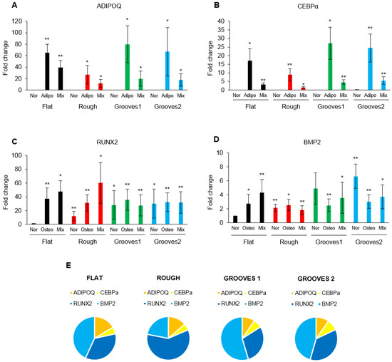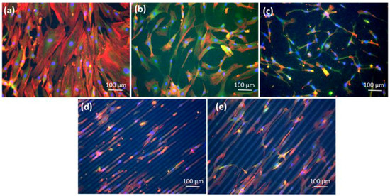 - Watari, S.; Hayashi, K.; Wood, J.A.; Russell, P.; Nealey, P.F.; Murphy, C.J.; Genetos, D.C. Modulation of osteogenic differentiation in hMSCs cells by submicron topographically-patterned ridges and grooves. Biomaterials 2012, 33, 128–136. [Google Scholar] [CrossRef]