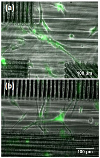- Béduer, A.; Vieu, C.; Arnauduc, F.; Sol, J.C.; Loubinoux, I.; Vaysse, L. Engineering of adult human neural stem cells differentiation through surface micropatterning. Biomaterials 2012, 33, 504–514. [Google Scholar] [CrossRef]