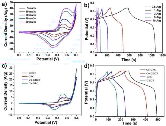 42]. When the current density increased, the charge/discharge time was significantly shortened. Compared to those of the Co-GPC, the similar redox peaks of the CV curves were also observed in Co-GHCP, GHCP, and GPC (