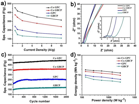 Figure 6d, the energy densities of Co-GPC, Co-GHCP, GPC, and GHCP were obtained at 18.43, 15.2, 9.8, and 7.9 Wh kg