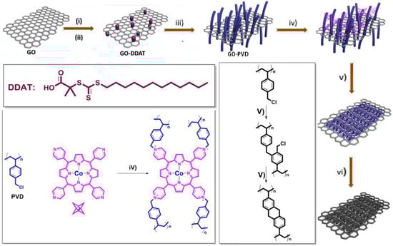 33]. The grafting ratio of DDAT in GO-DDAT calculated using elemental analysis reached 3.3%. Used as the RAFT macromolecular chain-transfer agent of GO-DDAT, monomers of 1,4-divinylbenzene and 4-vinylbenzyl could be grafted onto the GO surface through traditional RAFT emulsion polymerization in water, with the initiator of AIBN and emulsifier of PVA. Owing to the existence of methyl chloride, 5,10,15,20-tetra(4-pyridyl) Co (II) porphyrin (Co (TPyP)) could be crosslinked onto the GO-PVD through the nucleophilic substitution reaction to form Co-GO-PVD. The 2D porous hypercrosslinked polymer of Co-GHCP was then prepared using a FeCl