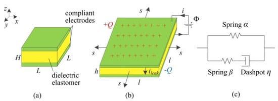 As shown in Figure 1a, a DEG is in the reference state with the lengths, L and L, and the thickness, H. When the membrane is subjected to an equal-biaxial stress, s, and a voltage, Φ, each electrode gets a charge, Q, and the membrane deforms homogeneously to the state with the lengths, l and l, and the thickness, h, accompanied by a leakage current, ileak, in the thickness direction, as shown in Figure 1b. The stretch ratio is defined as λ = l/L. The membrane is considered incompressible, namely, h = Hλ−2.