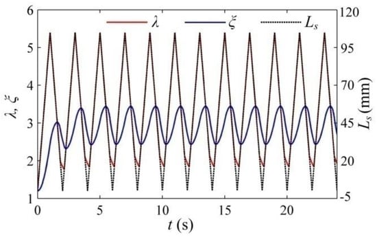 In the following section, by employing the established theoretical framework, we investigate the energy conversion of a dissipative DEG with the constant voltage cycle in which it can relax during the LT process. To use the existing experimental data [] to evaluate the established framework, in this simulation, the same VHB 4905 is chosen as the DE material and the material parameters are summarized in Table 1. The geometrical parameters of the DEG are also the same as those reported in the literature [] and selected as H = 0.5 mm, the minimum stretch ratio as λmin = 1.2, and the maximum stretch ratio as λmax = 5.4. In the experiment [], the VHB-based DEG was loaded by the motion of a linear servo motor, which is simulated in this section. According to the literature [], the servo displacement, Ls, ranges from 0 to 105 mm. Figure 2 describes the deformation of the DEG and the variation of the servo displacement for the first 12 cycles. The simulation results indicate that the DEG reaches a steady state after a few cycles, which is similar with the conclusion reported by the literature []. Figure 3 depicts the response of the DEG in a steady cycle. The parameter, sβ, denotes the stress on the dashpot, which is equal to the stress acting on the element, β. Figure 4 shows the energy harvesting circuit of the DEG with the constant voltage cycle. For consistency with the experiment [], the input voltage of the power supply is Φin = 2000 V, the reverse breakdown voltage of the zener diode is D20 Φout = 5000 V, and the limiting resistors is R0 = 50 kΩ. The implementation process of the constant voltage cycle is summarized as follows. At state A, though the servo loading cycle starts, the DEG does not start to be stretched and is still in the relaxing process. When the servo motor moves to state B, the DEG starts to be stretched by the servo motor. During interval BC, as the stretch ratio increases, the voltage between the electrodes decreases from Φout to Φin. During this process, the membrane is stretched under the open circuit condition and the charge on the electrodes can be dissipated slightly due to the leakage current. After state C is reached, the diode, D10, conducts and the DEG is charged until it is stretched to the maximum stretch ratio, λmax (state D). During interval CD, the voltage remains constant. During the stretching process (form state B to D), the membrane is mechanically stretched by the servo motor at a deforming rate of dλ/dt = 4.2 s−1. At state D, the membrane stops being stretched and starts to be relaxed. As the stretch ratio decreases, the voltage can increase gradually. When the voltage increases to Φout at state E, the reverse breakdown of the zener diodes, D20, occurs. From state D to E, the DEG is relaxed under the open circuit condition and the charge on the electrodes can be dissipated slightly due to the leakage current. When state E is reached, the DEG starts to be discharged. Then, the membrane continues to be relaxed until LT appears (the external force decreases to zero) at state F. In interval DF, the membrane is mechanically relaxed at a deforming rate of dλ/dt = −4.2 s−1. After state F is reached, the membrane can further contract during the LT process. When the membrane reaches state A, the servo motor returns to the initial position and the servo loading cycle, ABCDEFA, is completed. Then, the membrane continues to relax during the LT process until it reaches state B of the next servo loading cycle. In interval FB, the membrane operates during the LT process and the deforming rate of the membrane meets Equation (5). During the discharging process (from state E to B), the voltage remains constant. After the membrane reaches state B, the membrane starts to be stretched again, i.e., the DEG starts to execute the next energy harvesting cycle, BCDEFAB. Therefore, there is a delay between the servo loading cycle and the energy harvesting cycle, which is consistent with the experimental observations [].