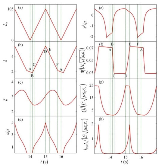 Variables as functions of time in a steady cycle. (a) The stretch ratio, (b) the inelastic stretch ratio, (c) the dimensionless nominal stress of the DE, (d) the dimensionless voltage, (e) the dimensionless charge, and (f) the dimensionless leakage current. (g) the dimensionless charge, and (h) the dimensionless leakage current. sβ is the stress on the dashpot, which is equal to the stress acting on the element, β.