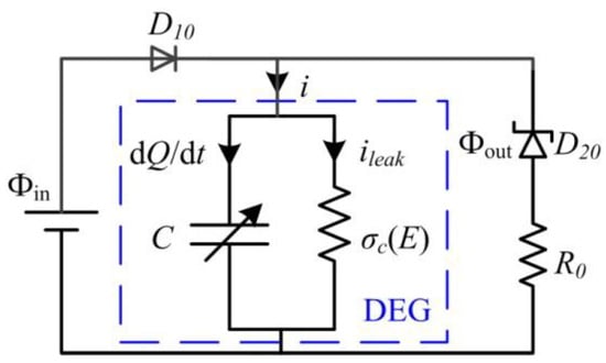 Considering the current leakage, the DEG is represented by a capacitor in parallel with a conductor []. The capacitance of the DEG capacitor is C = ε0εrL2H−1λ4, where ε0 is the vacuum permittivity, and εr is the relative dielectric constant of the DE material. As a capacitor, the charge on the DEG can be expressed as Q = CΦ. In addition, the electrodes and the wires are regarded as the perfect conductors. As shown in Figure 1b, the current in the conducting wire attached to the electrodes is expressed as I = dQ/dt + ileak. The leakage current can be written as follows []: