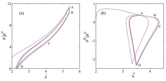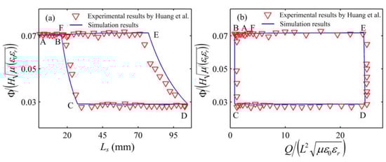 In the literature [], VHB is also selected as the DE material and the geometrical parameter, H, is the same as those reported in the literature []. However, values of the parameters, λmin and λmax, are different from those referred to in the literature []. For comparison with the experimental results [], in this simulation, the same DE material and geometrical parameters should be selected, and thus, λmin = 2 and λmax = 5.5 are set. According to the literature [], EEB = 30.6 MV/m and R = 1.13. The electrical parameters of the harvesting circuit are set as ΦH = 4.4 kV, the current limiting resistors, R1 = R2 = 50 kΩ, and the capacitance ratio, . For consistency with the experiment reported in the literature [], the membrane is stretched at a deformation rate of dλ/dt = 3.4 s−1 and relaxed at a deformation rate of dλ/dt = −3.4 s−1. During the charging process (from state A to B), the voltage between the electrodes increases at a rate of dΦ/dt = 2 ΦL. As shown in Figure 7a, the designed cycle, ABCDA, is consistent with the experimental data []. In our simulation, the energy density of the DEG with the designed cycle is 0.81 J/g, which is slightly higher than the experimental results [] (0.78 J/g).