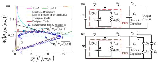 In Figure 7a, the enclosed curve GEFG denotes the triangular energy harvesting cycle of an ideal DEG, i.e., a DEG without consideration of the material viscosity and the leakage current. Figure 7b shows the energy harvesting circuit of the triangular cycle and the capacitance of the transfer capacitor is Cp. The implementation process of the triangular cycle has been well described in the literature [,] and is briefly summarized as follows. State G represents the stretching process in which the membrane is stretched from the prescribed minimum stretch ratio, λmin, to the maximum stretch ratio, λmax. At state G, the switches, S1, S2, and S3, are open. After the stretch ratio increases to λmax, the switches, S1 and S2, are closed. Then, the DEG is charged until the voltage between the electrodes increases to ΦL at state E. After state E is reached, the switch, S1, is opened and the DEG starts to be relaxed. To maintain the same voltage level between the DE and the transfer capacitor, with the decrease in the stretch ratio, the charges on the DEG flow to the transfer capacitor. For an ideal DEG, the membrane can be relaxed from state E to F along the line, EF. The slope of the line, EF, in the dimensionless plane is −C0/Cp, where C0 is the capacitance of the DE in the undeformed state. When state F is reached, the switch, S3, is closed to start the discharging process in which residual charges on the electrodes are harvested until the voltage on the DEG decreases to zero at state G. Then, the switches, S2 and S3, are opened and the membrane starts to be stretched again, i.e., the next cycle starts to be implemented. When the line, EF, is tangent to the electrical breakdown (EB) curve, the area enclosed by the triangle, EFG, reaches the maximum value. The coordinate of the tangency point, T, is (xT, yT). The EB voltage can be expressed as ΦEB = EEBHλ(R−2), where EEB is the electric breakdown field of the undeformed DE, and R is the strengthening exponent []. The relation between the capacitance, Cp, and the voltage, ΦL, is expressed as follows []: