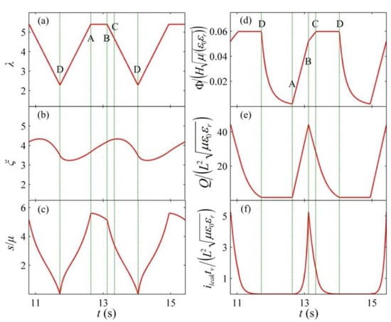 Variables as functions of time in a steady cycle. (a) The stretch ratio, (b) the inelastic stretch ratio, (c) the dimensionless nominal stress of the DE, (d) the dimensionless voltage, (e) the dimensionless charge, and (f) the dimensionless leakage current.