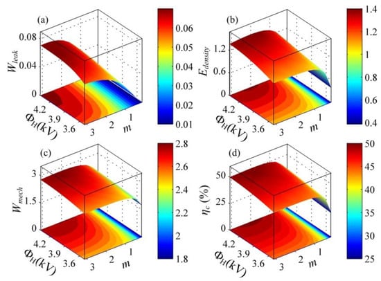 The influence of the voltage, ΦH, and the capacitance ratio, m, on the performance of a DEG. (a) The dimensionless dissipated energy due to leakage current, Wleak, (b) the dimensionless energy density, Edensity, (c) the dimensionless mechanical energy, Wmech, and (d) the conversion efficiency, ηc.