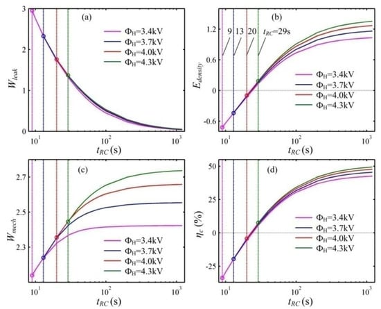 Figure 12 depicts the influence of the R-C time constant, tRC, and the capacitance ratio, m, on the performance of a DEG. In this analysis, we set the voltage, ΦH = 4300 V. As shown in Figure 12a, decreasing the R-C time constant, tRC, and increasing the capacitance ratio, m, can enhance the energy dissipation due to the leakage current. With the increase in the R-C time constant, tRC, the energy density and the conversion efficiency can increase (see Figure 12b,d)). As the capacitance ratio, m, increases, the energy density and the conversion efficiency can increase first and then decrease. There is an optimal capacitance ratio, m, to maximize the harvested electrical energy or the conversion efficiency for a prescribed R-C time constant, tRC. Moreover, as the R-C time constant, tRC, decreases, the optimal capacitance ratio, m, decreases and the maximum values of both the energy density and the conversion efficiency can decrease.
