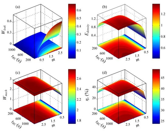 The influence of the R-C time constant, tRC, and the capacitance ratio, m, on the performance of a DEG. (a) The dimensionless dissipated energy due to leakage current, Wleak, (b) the dimensionless energy density, Edensity, (c) the dimensionless mechanical energy, Wmech, and (d) the conversion efficiency, ηc. The voltage, ΦH = 4300 V, is set.