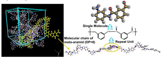 The crystalline content of meta-aramid fibers is low; they possess an amorphous content of 75–80% [2]. The crystallinity of aramid short-cut fibers and pulp were measured by Liao Ruijing [3]. The results showed that the crystallinity of aramid short-cut fibers was 13.17%, whereas the crystallinity of aramid pulp was only 1.53%. In contrast, the crystallinity of self-made aramid insulation paper is much higher [1]; after hot pressing, the crystallinity of self-made aramid paper is 35.04%, while that of Nomex paper is 43.43%, and the crystallinity of self-made pure aramid pulp paper after hot pressing is 7.2%. The crystallinity of meta-aramid fibers prepared by Zhiqing [4] ranged from 29% to 41%. Therefore, the amorphous regions represent the major component of the molecular structure of both Nomex paper, which has the best performance in the industry, and aramid insulation paper prepared in a laboratory. Both the crystalline and amorphous regions in insulation paper are important to its performance. However, the performance of the crystalline and amorphous regions of meta-aramid fibers has not been comprehensively studied, particularly their microscopic behavior at the molecular and atomic levels.