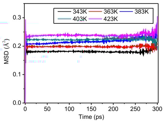 Figure 4 presents MSD time curves for crystalline regions of meta-aramid fibers at different temperatures. The trend of the chain motion of molecules in the crystalline regions over time is the same at different temperatures. With rising temperature, the chain motion of crystalline regions of meta-aramid fibers increased slightly. While the increase of chain motion is small, it shows pretty strong temperature dependence, which is especially obvious at about 250 ps. The main reason for this is that the influence of temperature on the physicochemical properties of crystalline regions of meta-aramid fibers was small in the temperature range studied here, showing that the crystal structure of meta-aramid fibers has good stability when exposed to the operating temperature inside a transformer for a long period.