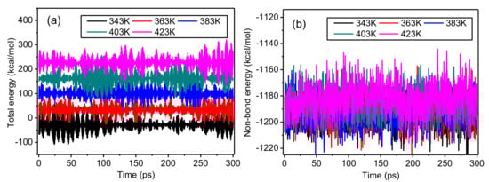 The changes of total energy and non-bond energy during the simulations at different temperatures are displayed in Figure 5. Figure 5a reveals that with lengthening simulation time, the model energy remained in dynamic balance, showing that the previous optimization achieved its expected purpose. The molecular kinetic energy increases with temperature, and the total energy of the model also increases. Figure 5b illustrates that although the non-bond energy of the model increases with temperature, the difference in the non-bond energy at different temperatures is small. Therefore, the influence of the thermal field in the temperature range that was used in this work on the van der Waals interactions inside the crystalline regions is small.