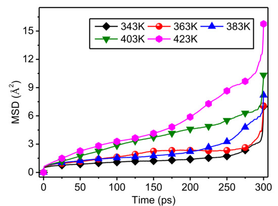 The MSD time curves for the amorphous regions of meta-aramid fibers at different temperatures are shown in Figure 7. The molecular chain motion of amorphous regions showed a positive correlation with temperature. When the temperature was low, the increase of the MSD of the amorphous regions was slow. Conversely, when the temperature was high, the increase of MSD was rapid, which was manifested as a steeper curve, indicating the stronger molecular chain motion of the amorphous regions at higher temperature. Comparing the curves revealed that the MSD time curves at 343 K and 363 K were similar. After about 225 ps, the higher the temperature, the lower the curve, and the larger the difference between the MSD values of all of the curves. These results show that the molecular chain motion in the amorphous regions is highly sensitive to temperature. Therefore, decreasing the operating temperature of a transformer can effectively improve the thermal stability of amorphous regions of meta-aramid insulation paper.
