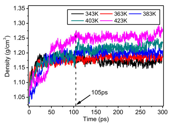 The changes of density of the amorphous regions of meta-aramid fibers during simulations at different temperatures are presented in Figure 9. In the first 105 ps of the simulations, the density of the model increased greatly. After 105 ps, the density did not obviously increase, indicating that the steady-state density is the actual density of the model at a corresponding temperature. The density of the model increased with temperature, which is mainly because the motion of molecular chains strengthened with rising temperature; the model volume also increased. In the NPT ensemble, it is necessary to decrease the model volume V to maintain constant pressure P of particle population N in the model; namely, to fix the model quality. Therefore, the model density was slightly increased. The stronger the motion of molecular chains in the model, the quicker its volume decreases, and the greater the increase of model density. The densities of the model at 343 K, 363 K, and 383 K were similar. In contrast, the densities at 403 K and 423 K were quite different, especially after about 250 ps. This result shows that a higher temperature induces a stronger chain motion in the amorphous regions of the meta-aramid fibers, lowering their thermal stability. Therefore, it is important to minimize the time that a transformer operates at high temperature to maintain the long-term effective operation of meta-aramid insulation paper.