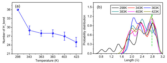 To further analyze the influence of temperature on hydrogen bonding in the model of the amorphous regions of meta-aramid fibers, the relation between hydrogen bond number and temperature is displayed in Figure 13a, which was obtained from repeated simulations. The hydrogen bond number of the model increases with temperature, which is mainly because the motion of fiber molecular chains is enhanced with rising temperature and the intramolecular atom space is changed, which increases the opportunity for intramolecular hydrogen bonds. With the further rise of temperature, the hydrogen bond number decreases slightly, which is mainly because the further rise of temperature further increases the chain space until the original hydrogen bonding network is damaged. In addition, the intramolecular distance can no longer meet the conditions for the formation of a hydrogen bond; therefore, the hydrogen bond number decreases slightly. The hydrogen bond number is similar for the different simulations using the model for the amorphous regions, which is consistent with reported results [50].
