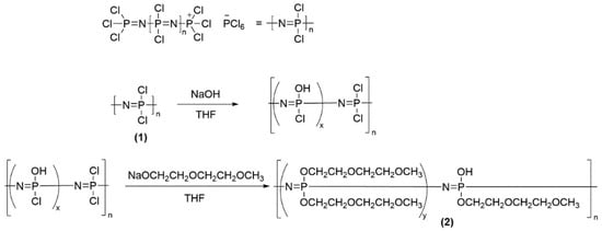 The precursor polymer, [NPCl2]n (1), was synthesized based on a synthesis route published by Wang et al. [32,33] and a cationic living polymerization reaction (first published by Allcock et al. [34]) with minor modifications [35]. The intermediate poly[bis 2-(2-methoxyethoxy)ethoxy-co-hydroxophosphazene] (2) was obtained by nucleophilic substitution of chlorine with a corresponding ratio of sodium alcoholate and sodium hydroxide according to Figure 1. The functionalization of polyphosphazenes with oligoether side chains was already published earlier [14].