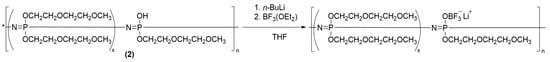 The final product, poly[bis 2-(2-methoxyethoxy)ethoxy-co-oxytrifluoroborate lithium phosphazene] (3;4), was obtained via the synthetic route described in Figure 2. The previously purified and dried poly[bis 2-(2-methoxyethoxy)ethoxy-co-hydroxophosphazene] (2) was dissolved in dry tetrahydrofurane and cooled to −40 °C in an ice/CaCl2 bath. 20 mL of 1.6 M n-butyl lithium (in hexane) solution was added dropwise to the polymer solution. The reaction solution was stirred for 1 h at room temperature. After the polymer was dissolved completely, the solution was cooled once again to 40 °C and 5 mL of boron trifluoride diethyl etherate was added dropwise afterwards. The reaction mixture was then stirred for 24 h. The final product poly[bis 2(2-methoxyethoxy)ethoxy-co-oxytrifluoroborate lithium phosphazene] (3;4) with a specific substitution ratio (5 mol % in polymer 3, and 10 mol % in polymer 4) was obtained after being dried under vacuum at 60 °C.