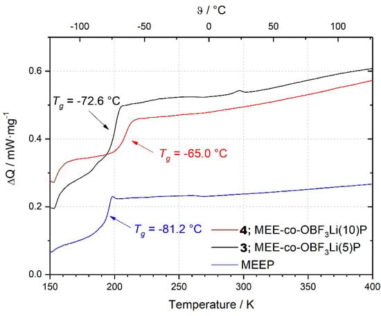 DSC Measurements of MEEP, MEE-co-OBF3Li(5)P, and MEE-co-OBF3Li(10)P.