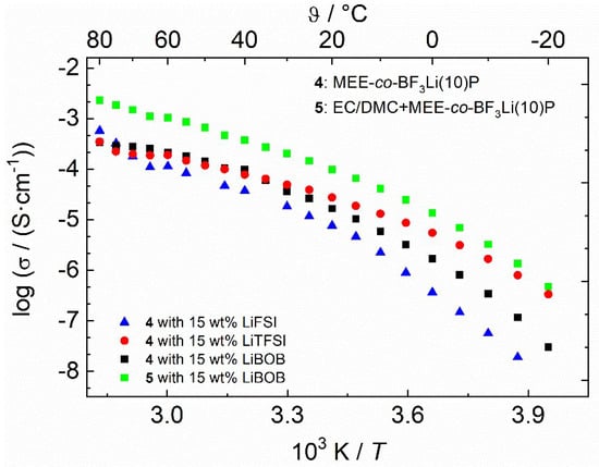 Table 1 summarizes the ionic conductivities of selected polymers at certain temperatures. The ionic conductivities of the pure polymers 3 and 4 without additionally dissolved lithium salts are 3.2 × 10−6 and 2.5 × 10−6 S·cm−1, respectively, at 25 °C, which are well comparable to other modified MEEP based polymers reported in the literature (2.5 × 10−6 S·cm−1 as reported by Allcock; 5 × 10−9 S·cm−1 as reported by Fiedler, both at 25 °C) [26,27,39]. LiTFSI, LiFSI, and LiBOB were added to the as-prepared polymers to produce salt-in-polymer electrolyte membranes. As shown in Figure 4, polymer 4 with LiTFSI exhibits the highest ionic conductivity in the low temperature range (4.9 × 10−5 S·cm−1 at 30 °C). While at high temperature ranges, polymer with LiFSI shows a better of 5.0 × 10−4 S·cm−1 at 80 °C. After adding EC/DMC to the dry polymer, the total conductivity is enhanced by almost one order of magnitude. The total conductivity of polymer 5 with LiBOB reaches 2.5 × 10−3 S·cm−1 at 80 °C.