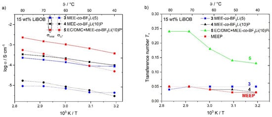 Figure 5a shows the Arrhenius-type plots of the temperature dependent total conductivity, σtotal, and the partial lithium conductivity, σLi+, of polymers 3,4, and 5 each containing 15 wt % dissolved LiBOB, while Figure 5b plots the corresponding lithium ion transference numbers, T+. With a higher substitution ratio, polymer 4 shows better total and lithium conductivity compared to polymer 3 at almost all measured temperatures (except σLi+ at 40 °C). However, for both polymer electrolytes 3 and 4, the obtained lithium transference numbers show similar values lower than 0.1, which are lower than PEO (typically around 0.15) [15]. Desirably, the introduction of the OBF3-Li group would contribute to more mobile lithium ions, thus leading to a higher concentration of the free charge carrier and increasing lithium conductivity. However, the determined lithium transference number is only slightly better than MEEP salt-in-polymers at lower temperatures [14].
