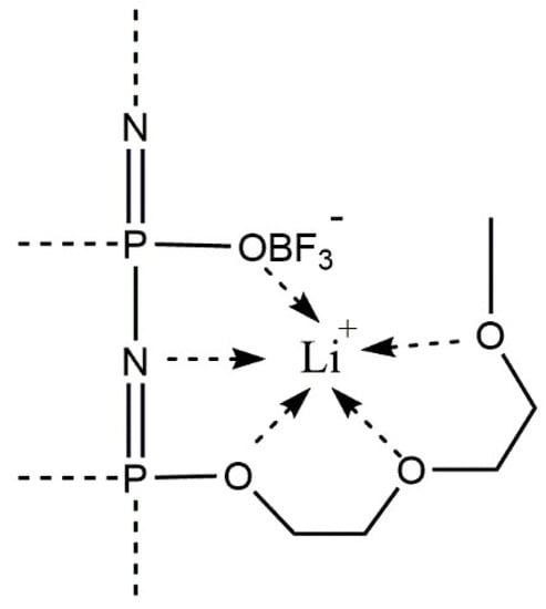 Recently, we introduced the concept of polymers with immobilized anionic trifluoroborate groups. These are easy to prepare and tend to favor a good dissociation of the charge compensating lithium ions [28]. It is to be expected that the glass transition temperature will increase with the concentration of anionic substituents which, however, cannot be increased to 100% of the phosphorous sites as an increase soon will lead to much less segmental mobility of the polymer and accordingly to a slowing down of the cation mobility. The latter may be partially stopped by adding a liquid solvent to form a polymer gel. However, a compromise is an appropriate ratio of donor substituents with ether oxygens (usual lithium ion solvating groups in ether-based salt-in-polymer electrolytes) and additional more rigid anionic groups (each combined with a free lithium ion). The ratio can be optimized to achieve good ion mobility and lithium ion concentration and hence a favorable partial conductivity of lithium ions.