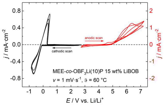 Figure 7 shows the cyclic voltammogram of several anodic and cathodic cycles of polymer 4 with 15 wt % LiBOB salt at 60 °C. An anodic oxidation is evident by an increase of current density beginning at 4.5 V for the electrolyte MEE-co-OBF3Li(10)P/LiBOB, which agrees with the usually reported anodic stability referred to Li+/Li for PEO based electrolytes [43,44] and is caused by irreversible oxidation within the polyether chains [14,45]. The reversible lithium plating/stripping process becomes visible in the corresponding cathodic scan (around 0 V). Maximum current densities of −0.80 mA·cm−2 during lithium deposition and 0.64 mA·cm−2 during dissolution yield a coulombic efficiency of 80%. The loss of lithium indicates the formation of a SEI.