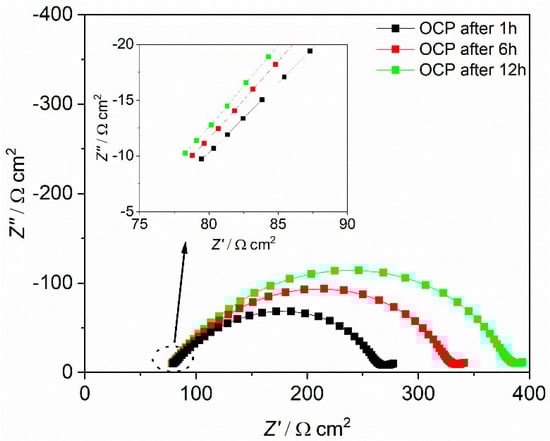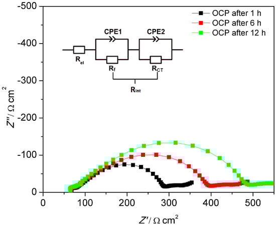 Impedance spectra of Li|MEEP/LiBOB|Li at 60 °C after 1, 6, and 12 h under OCP. The table lists the corresponding Rel, Rf, and RCT at different stages. Rel is the electrolyte bulk resistance and Rint is the interface resistance, which consists of Rf and RCT.