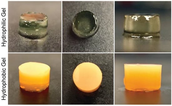 Polymerized drug-loaded bioinks. The upper row shows images of the polymerized hyaluronic acid-based bioink, loaded with lisinopril at a concentration of 40 mg/mL. This bioink has a WHANB value of 3% and a TL of 2 min. The bottom images show polymerized poly(ethylene glycol) diacrylate (PEGDA) gels with a WPEGDA value of 30%, a WEtOH value of 20%, and a TL of 1.0 min.