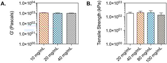 Spironolactone was chosen as the second model drug in this study due to its high hydrophobicity. The model drug was dissolved in a PEG-based bioink specifically engineered for hydrophobic drugs, at a concentration of 20 mg/mL. Fifty µL of formulation were pipetted into a modified syringe, the solution was exposed to light for 1 min (Figure 1), and the tensile strength of the resulting gel was measured (Figure 2B). Results show an average tensile strength for this material of 176.66 kPa. The typical tensile strength of pharmaceutical tablets is within the range of 1 and 10 MPa []. The G’ obtained for this gel is well below this range, and therefore, this material should be used in combination with a preform tablet that provides support and physical stability to the oral dosage form. Furthermore, the effect of drug concentration on the mechanical properties of the gel was studied by measuring the tensile strength of gels containing 100, 80, 40, and 20 mg/mL. Figure 2B shows that drug concentration had no impact on the tensile strength of the material. This contrasts with results previously demonstrated [], where a decrease in tensile strength was observed with increasing naproxen and ibuprofen concentrations. This divergence is due to the lower WPEGDA value used in this formulation (30%). These results indicate that softer materials consisting of photo-polymerized bioinks, such as the hyaluronic acid hydrogel, tend to have a steady mechanical stability when exposed to increasing drug concentrations. Stronger gels can experience substantial differences in mechanical properties (Figure S2).