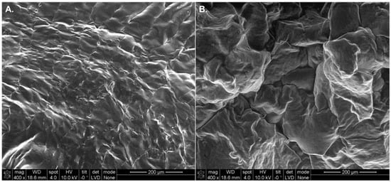 Cross-sectional SEM micrographs of polymerized bioinks loaded with lisinopril and spironolactone. (A) Lyophilized lisinopril-loaded hydrogel (40 mg/mL) with a WHANB of 3% and a rratio of 0.6. This bioink was exposed to a TL of 2 min. (B) Polymerized hydrophobic ink loaded with spironolactone (20 mg/mL). This formulation contained a WPEGDA of 20% and a TL of 1 min.