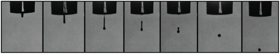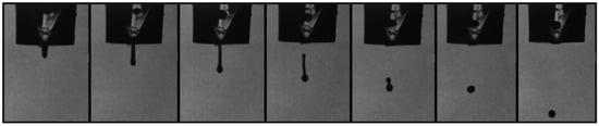 To study the droplet formation ability of these bioinks, the inverse of the Ohnesorge number, denominated as Z value, was calculated (Equation (3)). This dimensionless number considers the inertia and surface tension forces of a fluid over its viscosity forces to define its droplet formation ability. The orifice radius of the nozzle used for the inkjet printing of the fluid is also a factor taken into consideration within this number. Z values between 4 and 14 are considered printable fluids []. Values above 14 typically exhibit the formation of satellite droplets, whereas values below four present strong viscous forces. The viscosity, surface tension, and density of the bioinks was quantified, in order to determine their Z value. Table 1 shows the results obtained for these parameters at room temperature and the Z value for the two bioinks utilized in this study. The hydrophilic bioink experienced a higher viscosity value (9.83 cP), resulting in a lower Z value than the hydrophobic formulation. The later one had lower viscosity and surface tension parameters (4.88 cP and 31.41 mN/m, respectively), resulting in a higher Z value of 10.52. However, both formulations fell within the defined range for printable fluids as depicted in Figure 4 and Figure 5, where the droplet formation sequence of these bioinks can be observed.